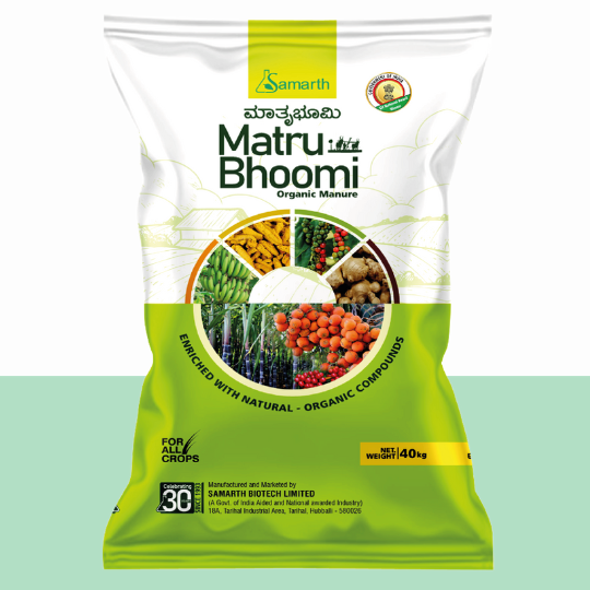 Samarth Matru Bhoomi is a press mud-based well decomposed Organic manure enriched with multiple organic compounds. Neem Cake, Karanja Cake, Turmeric Cake, Castor Cake, Rock Phosphate, Vermi compost, Gypsum, Poultry Manure, Goat Manure, Biostimulants (Humic, fulvic, amino acid, and seaweed extracts), and Beneficial organisms.
