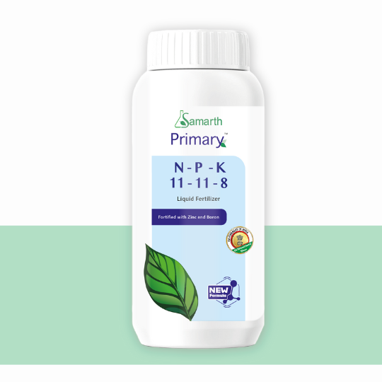 Samarth Primary™ NPK 11:11:8 represents a one-of-a-kind liquid fertilizer comprising key nutrients Nitrogen, Phosphorus, and Potassium, fortified with Zinc and Boron, meticulously crafted for foliar, drip and drench applications. Specifically engineered for pre-sowing.