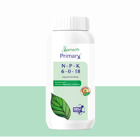 Samarth Primary™ NPK 6:0:18 is a premium Nitrogen: Potash liquid fertilizer fortified with Calcium, Magnesium, and Boron in suspension form. This powerhouse blend is tailored for vegetables and fruit crops, providing targeted support during post-bloom and physiological maturity stages.